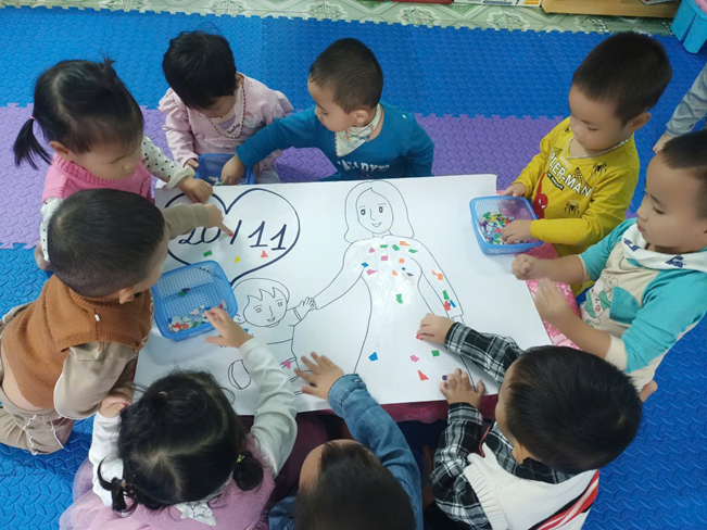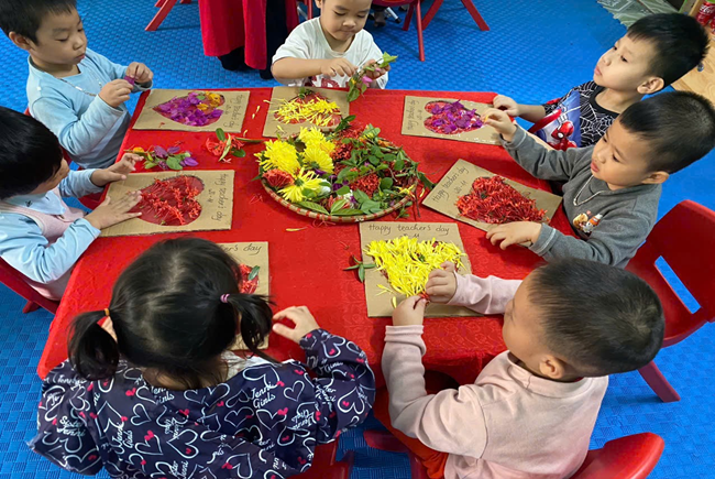 Hoạt động sáng tạo tặng thầy cô: Đây là hoạt động được các bé vô cùng yêu thích, với các phần làm thiệp, vẽ tranh và trang trí sản phẩm handmade đầy màu sắc. Dưới sự hướng dẫn kiên trì, tận tâm của các cô giáo, những đôi bàn tay nhỏ xinh đã tạo nên biết bao sản phẩm đáng yêu và độc đáo. Dù nét vẽ còn đơn sơ hay từng mảnh giấy dán còn vụng về, mỗi sản phẩm đều chứa đựng tình cảm hồn nhiên, chân thành của trẻ. Những tấm thiệp và món quà nhỏ ấy trở thành lời tri ân ý nghĩa nhất mà các bé dành tặng “Cô giáo – người mẹ hiền thứ hai” của mình trong ngày đặc biệt.