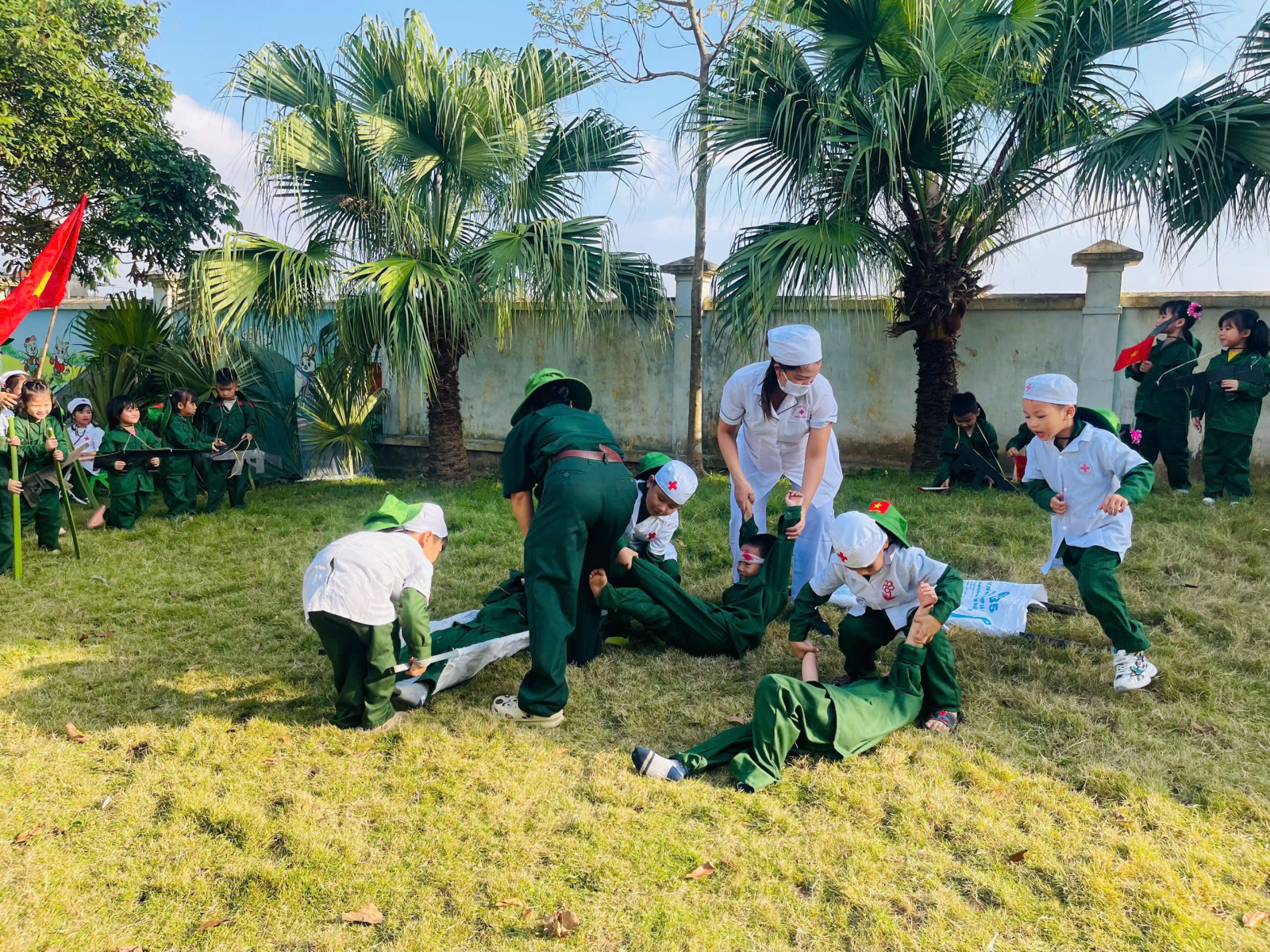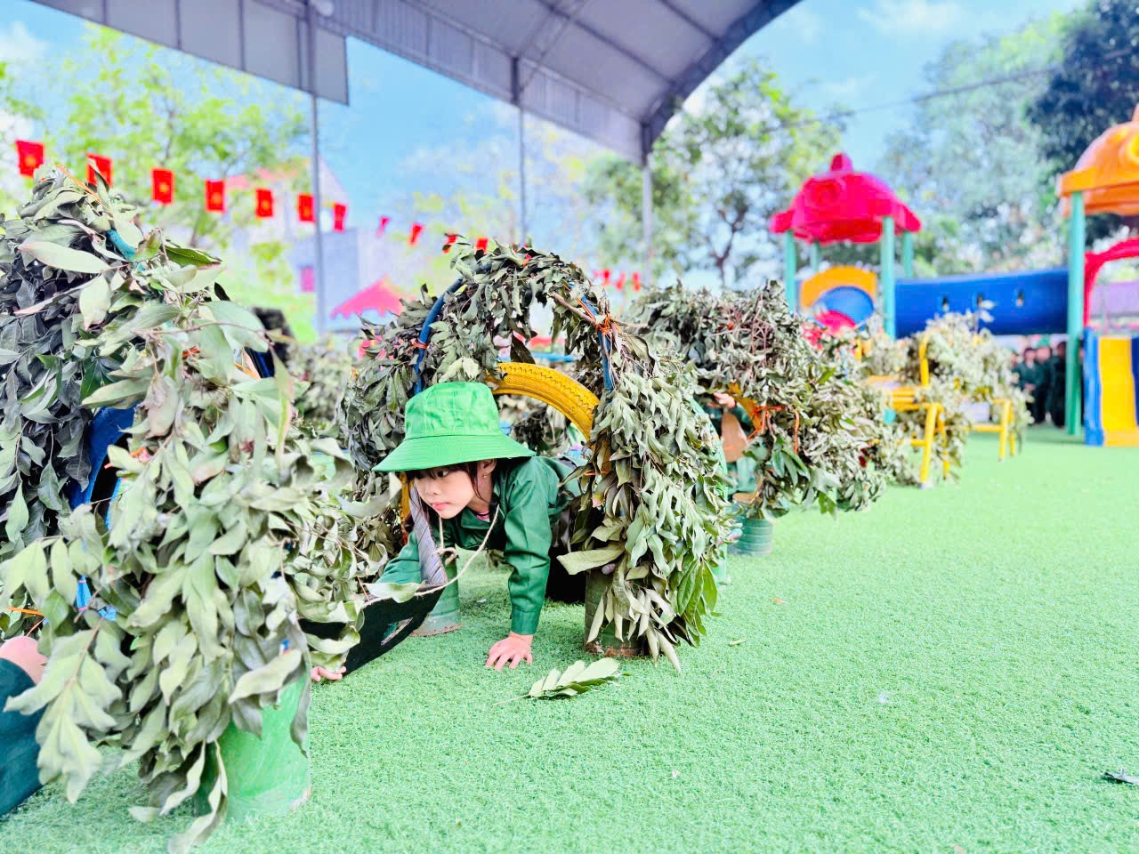 Tiếp nối là hoạt động trải nghiệm “đánh trận giả” với các tình huống vận động phù hợp lứa tuổi. Trong vai những “chiến sĩ nhí”, trẻ hào hứng tham gia các hoạt động phối hợp nhóm như vượt chướng ngại vật, bò thấp chui cổng…, qua đó rèn luyện sự nhanh nhẹn, mạnh dạn, tinh thần đoàn kết và ý thức kỷ luật