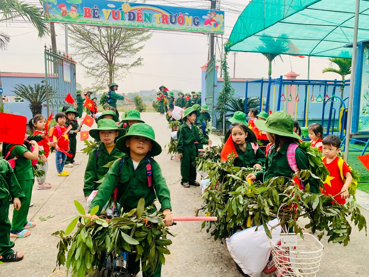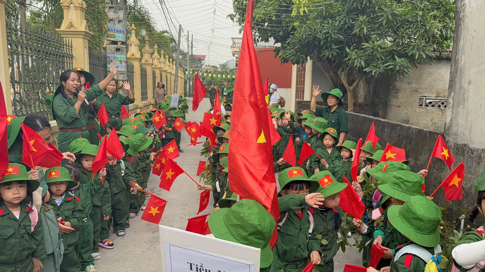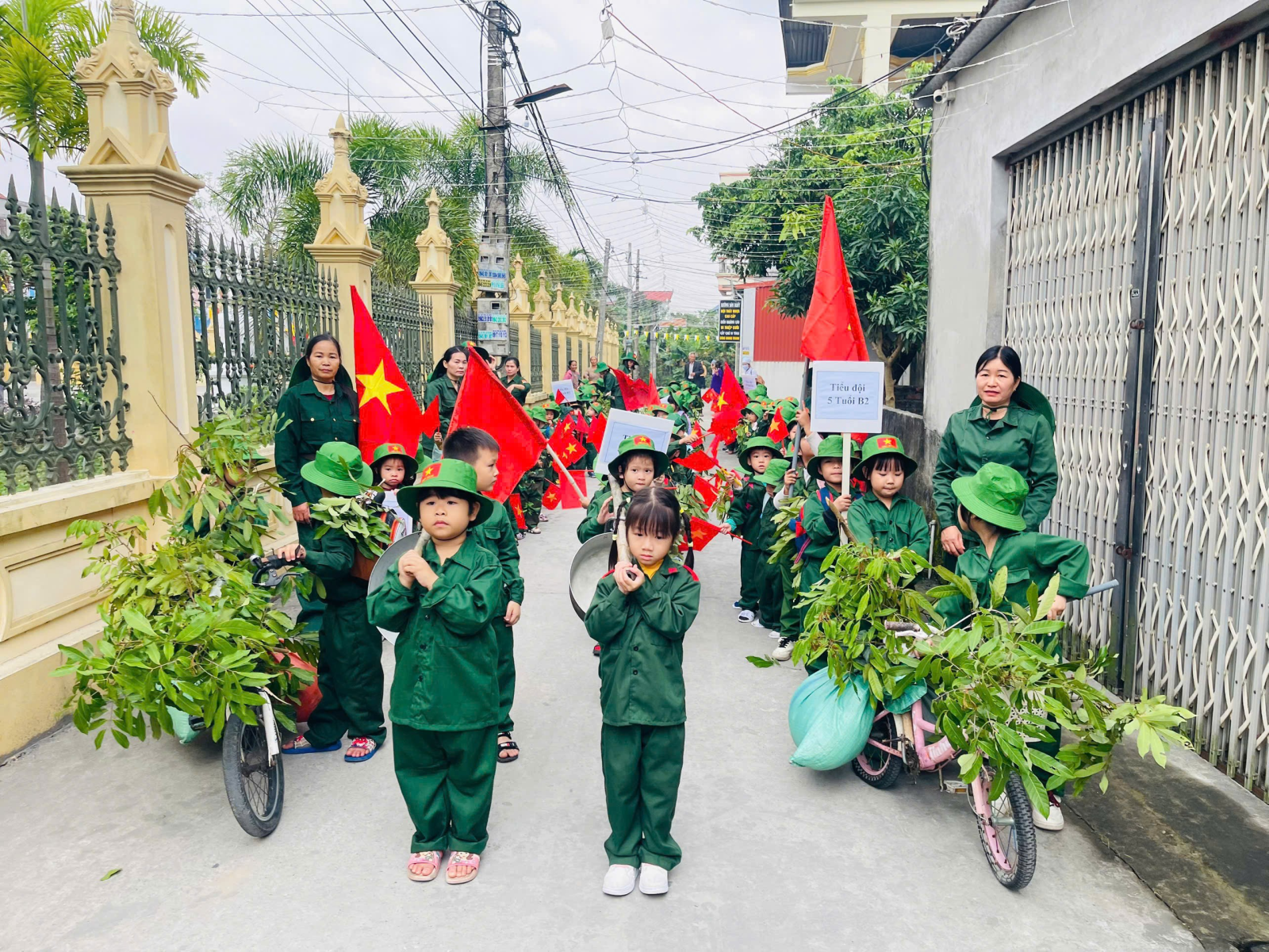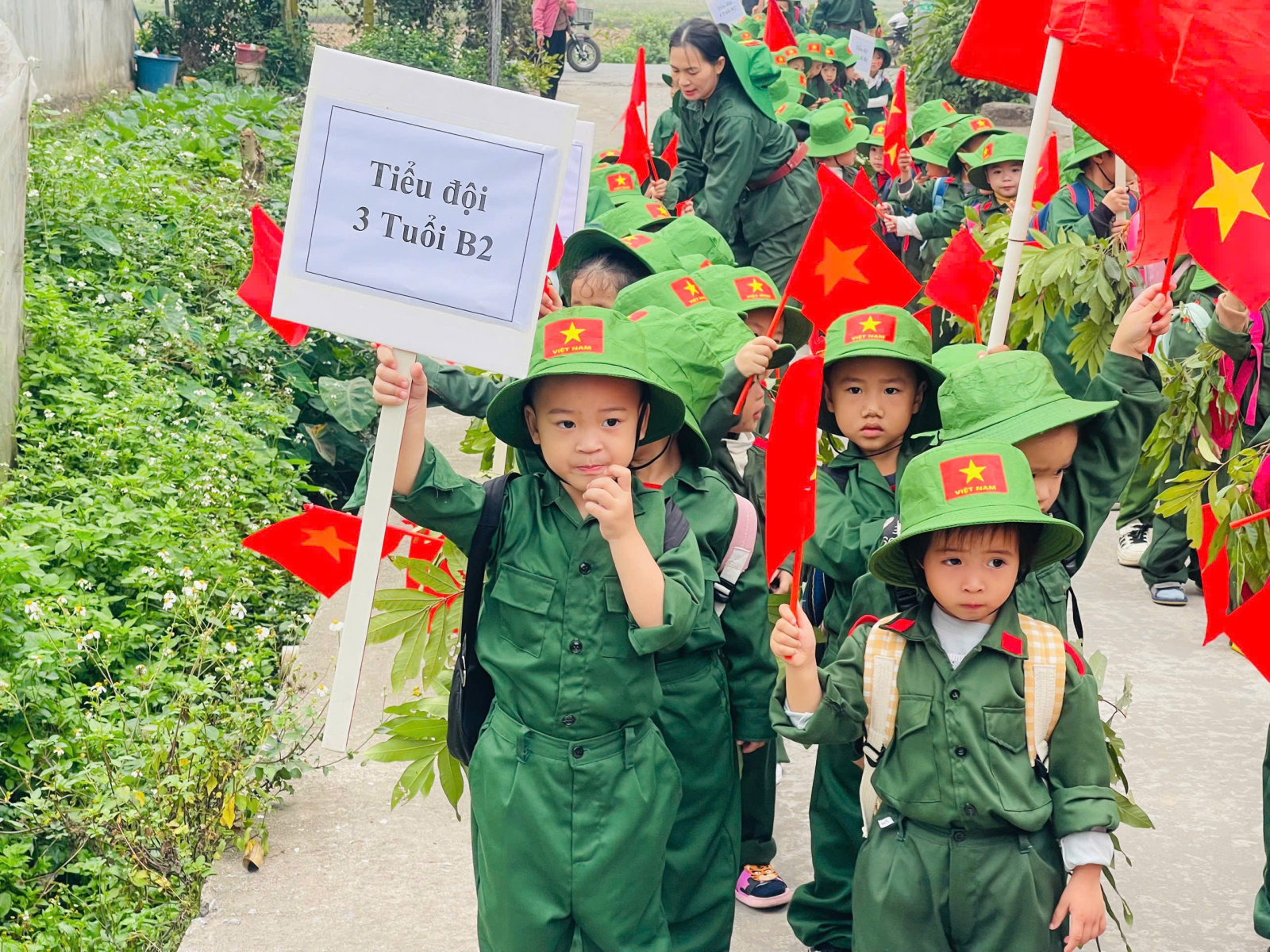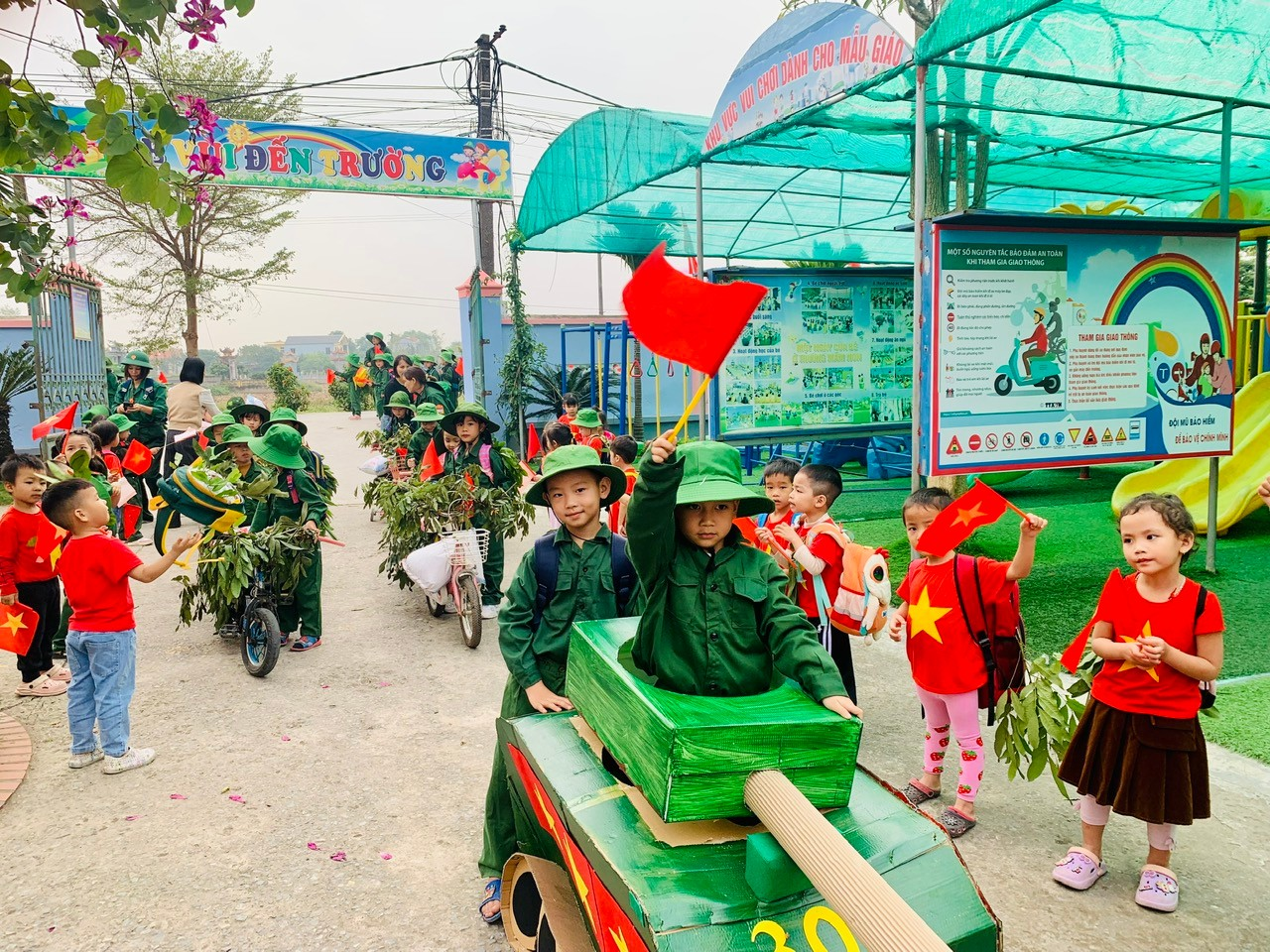 Không khí chương trình càng thêm sôi nổi khi các bé tham gia diễu hành đội ngũ trong tiếng trống rộn ràng, tay cầm cờ, bước đi ngay ngắn theo hiệu lệnh. Hoạt động diễn ra trang nghiêm nhưng gần gũi, góp phần hình thành cho trẻ tác phong gọn gàng, ý thức tập thể và niềm tự hào khi được tham gia các hoạt động mang ý nghĩa truyền thống.