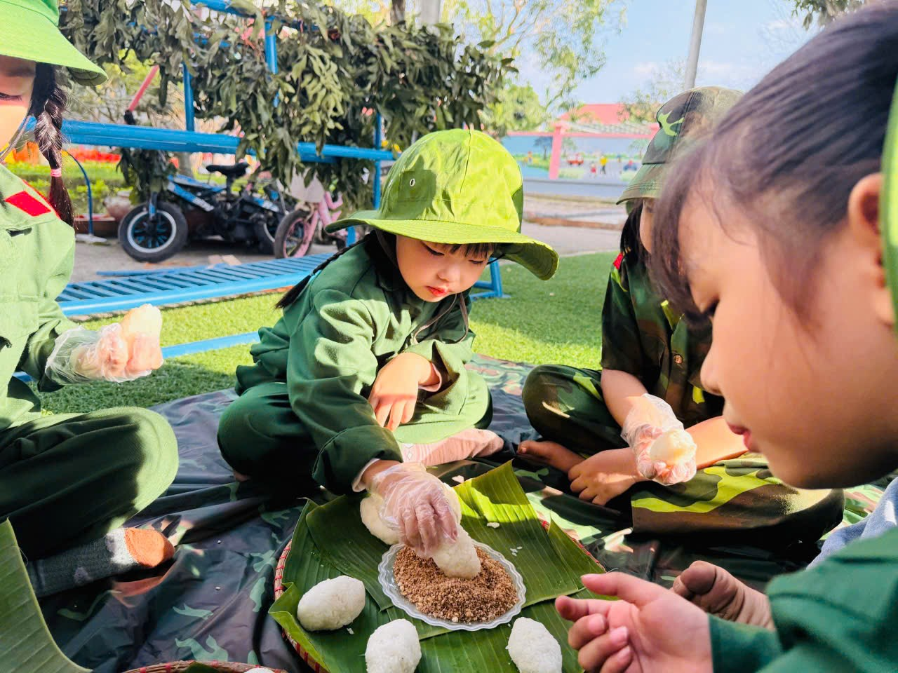 Khép lại chuỗi hoạt động là phần trải nghiệm giã lạc – muối vừng và thưởng thức cơm nắm muối vừng. Thông qua những thao tác đơn giản, gần gũi, trẻ được tìm hiểu về món ăn dân dã gắn liền với đời sống sinh hoạt, chiến đấu của bộ đội, từ đó giáo dục trẻ biết trân trọng bữa ăn, yêu lao động, cảm nhận được sự giản dị và tinh thần vượt khó của các thế hệ cha anh đi trước.