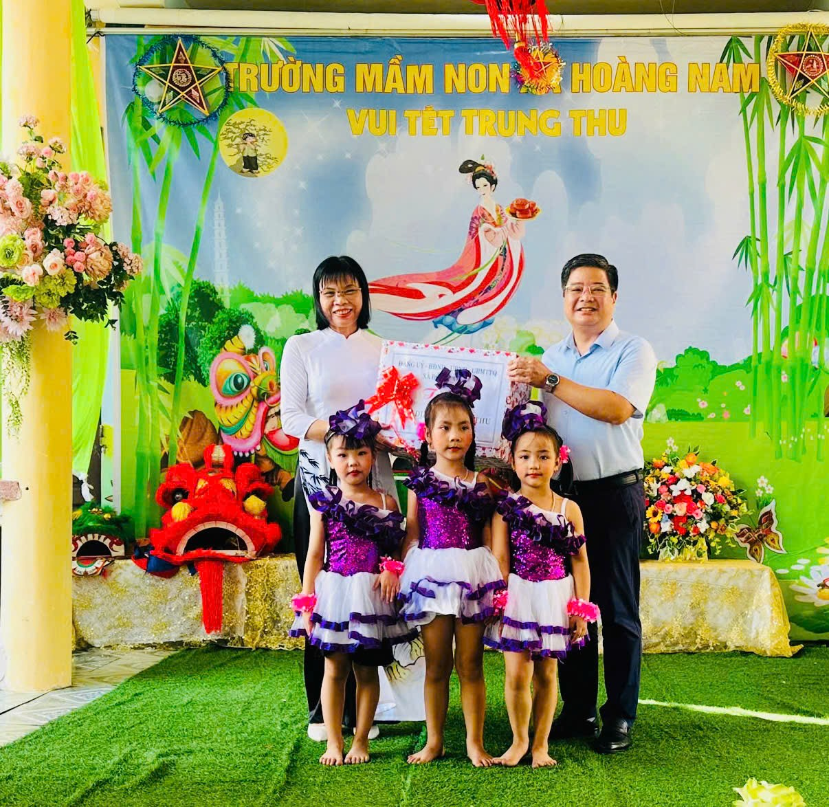 Hòa trong không khí ấm áp ấy, trường Mầm non Hoàng Nam đã tổ chức chương trình liên hoan văn nghệ “Bé vui đón Tết Trung thu” cho các bé. Trong ngày hội “Bé vui đón tết Trung thu” các con thiếu nhi Trường Mầm non Hoàng Nam đã nhận được sự quan tâm của các cấp lãnh đạo địa phương đã về thăm và tặng quà cho các con nhân dịp Tết trung thu.